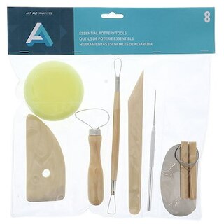 This 8 Piece Pottery Kit tool contains a loop tool, a ribbon tool, a wooden rib,a flexible metal rib, a needle tool, a wood modeling tool, wire clay cutter and a small sponge.